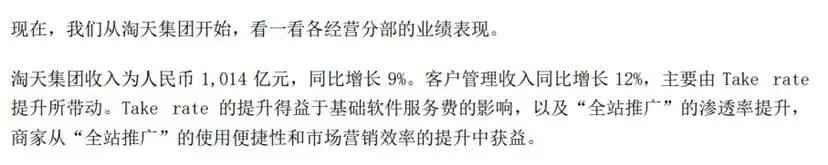 “客户管理收入同比增长10%至人民币892.52亿元(124.59亿美元),主要由take rate提升所驱动-这得益于去年9月新增的基础软件服务费以及全站推广的渗透率提升。”