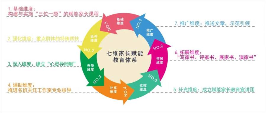 怎么办?必须面对真实的现实问题,持续进行创新探索实践!几年来,随着学校教师人数增多、师资力量的大幅度提升,学校德育处、政教处,以及区名班主任工作室等,联合展开了主题式、项目化的实践探索攻关,最终形成了“七维五度”共育策略——3.0版的家长赋能教育体系。