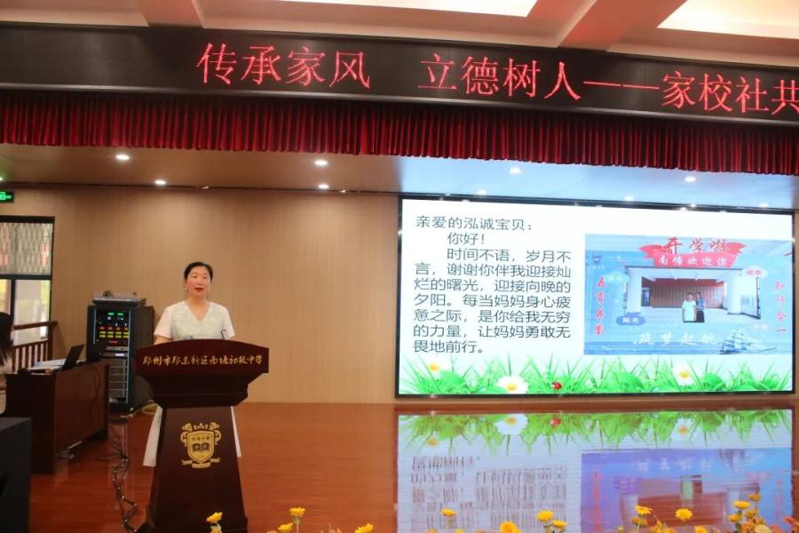10月11日16:00,在郑州市郑东新区南塘初级中学(以下简称“南塘初中”)七(7)班教室里,伴随着歌曲《时间都去哪儿了》的感人旋律开场,记者观摩了一场别开生面的“特殊家长会”——以“一封家书寄深情,家校共育伴我行”为主题的家校、亲子交流活动。除了陈颢月同学爸爸念了写给女儿的激励话,张宸汐、周煜、魏嘉言、岳宇熙同学的妈妈也读了平常面对孩子可能讲不出来的温情、期待之语。