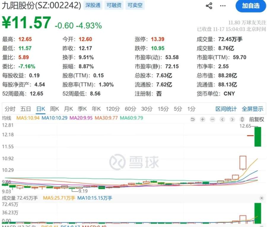 最为离谱的是资本市场的反应。11月12号相关产品发布后,A股“九阳股份”迅速从水下拉升,最终收红2.24%,并在13、14号产品传播发酵后一字涨停。虽然公司紧急辟谣称公司主体与下属子公司均不涉及食品、饮料等产品的研发、生产与销售,以至于17日开盘后股价跌幅达4.93%,但按照九阳股份当下88亿的市值核算,这个爆款产品共带来超过10亿的纸面回报。