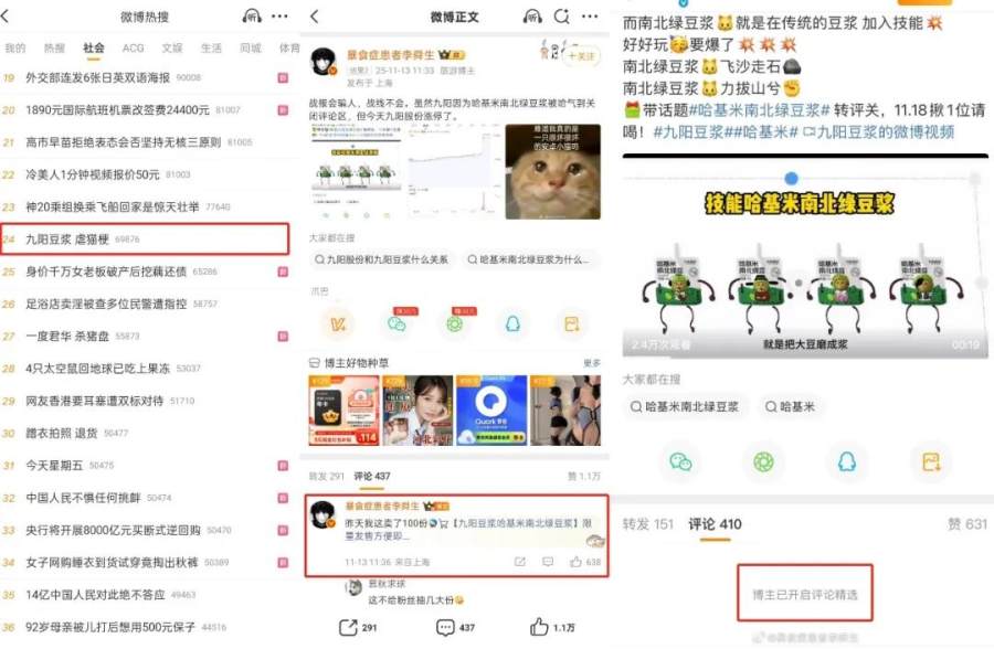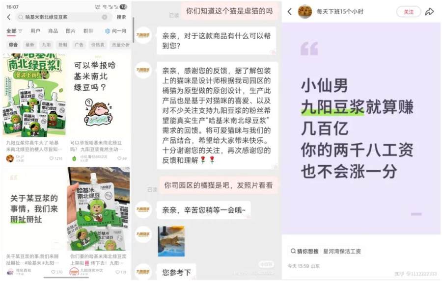 这种行为引发了大量受众的不满——“圆头耄耋”本身就是谐音“猫爹”,以讽刺那些极端爱猫者的梗。这次被抵制后,反而愈发激起了报复式下单。而九阳官方客服在针对“虐猫”质疑时声称的“拍摄自己园区的小猫”,又上演了一场经典的打脸爽文剧情,给整场事件增加了不少离奇谈资。微博、知乎、小红书等口水战平台上的互撕,呈渐进式的将该产品的热度一步步推向顶峰。