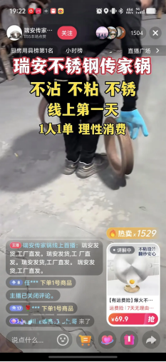 但走红背后,仿冒乱象已然滋生。据极目新闻报道,16日晚,一个直播页面引起网友们注意,直播页面上写有“瑞安不锈钢传家锅”“不粘不锈”“线上第一天”“1人1单理性消费”等字样,无主播出镜仅循环播放车间画面,配以 “最后 50 单”“停产一个月” 等饥饿营销话术,69.9 元的标价吸引 1500 余人在线观看,最终登顶厨具销量榜。