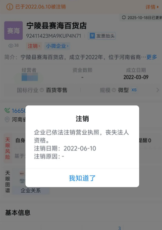 其中,该直播间运营主体为宁陵县赛海百货店,其营业执照早在 2022 年 6 月就已注销。在有人致电核实后,对方不再接听电话,涉事账号随后也无法搜索。