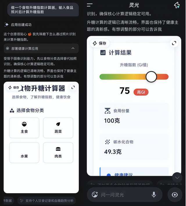 字母榜(ID: wujicaijing)进行实测,要求灵光创造一个“食物升糖指数计算器”。经过十几秒思考后,灵光就做出了这款小应用,能够根据食物类型、分量等判断具体的升糖指数,并提供健康建议。