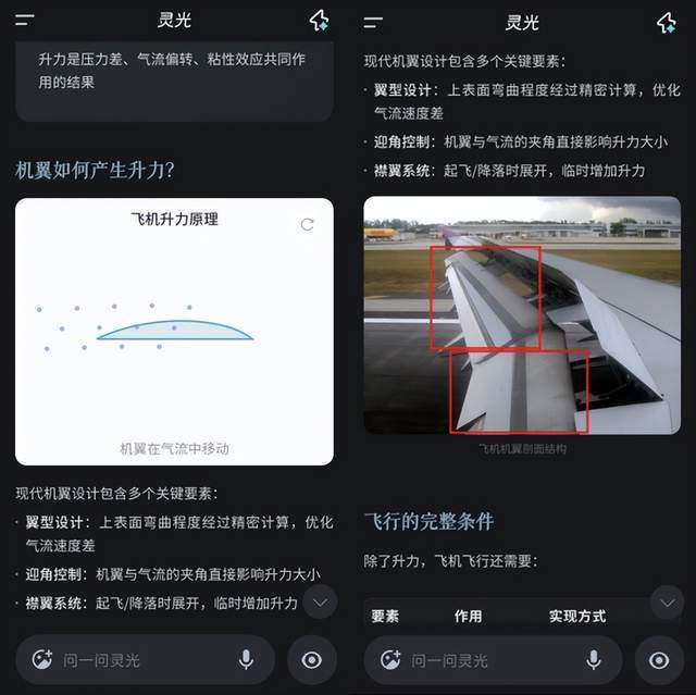 例如,当用户提问“青铜爵是用来干什么的”“飞机为什么会飞”等专业知识问题时,传统的AI应用往往会连篇累牍输出文案。灵光则在文字解释之外,提供真品照片、可交互图表、3D实物动图等多模态内容,还能一键生成长图。