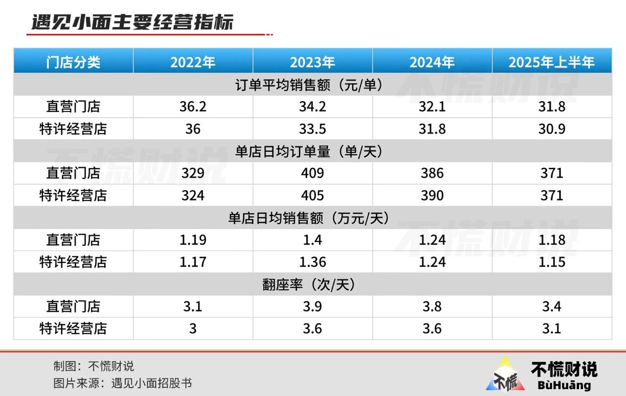 以直营门店举例,在经历短期单量冲高后,2023年至2025年6月末,遇见小面翻座率由3.9次/天降至3.4次/天;单店日均订单量由409单/天降至371单/天;单店日均销售额由1.4万元/天降至1.18万元/天,加盟店也同样出现这一现象。