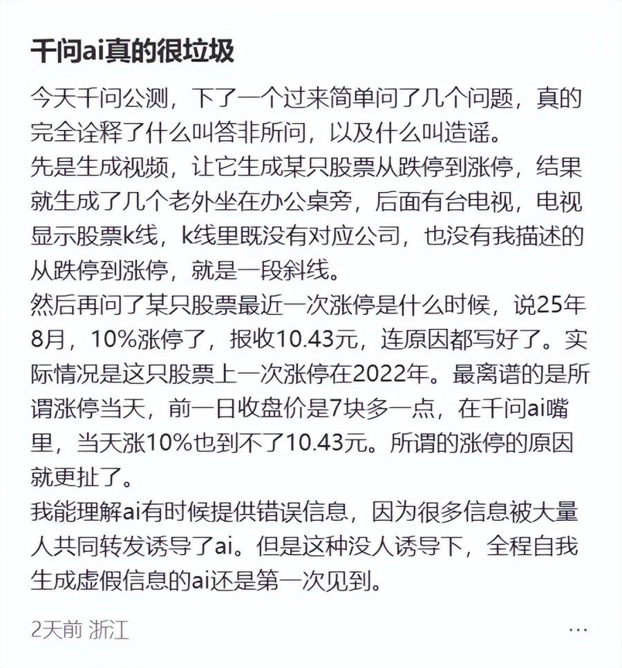 “趣解商业”体验发现,千问在文字处理上与豆包、Kimi的水平相当,在写作上与其他AI对话助手都存在不同程度的幻觉。社媒平台上,有用户直言遇到了答非所问的千问,“提问某只股票最近一次涨停是什么时候,说25年8月,10%涨停了,报收10.43元,连原因都写好了。实际情况是这只股票上一次涨停在2022年。”还有用户测评之后吐槽“最简单的乘法都能算错,有投广告的钱不如好好改进产品”。