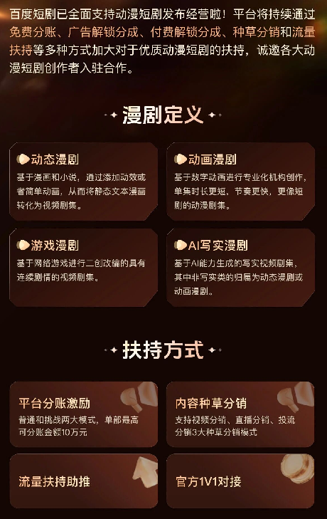 今年5月1日,百度发布了“动漫短剧合作指南”,以平台分账激励、内容分销、流量扶持等方式扶持漫剧。7月,百度发布“漫剧星跃计划”,“度加”创作平台对AI漫剧也有所扶持。