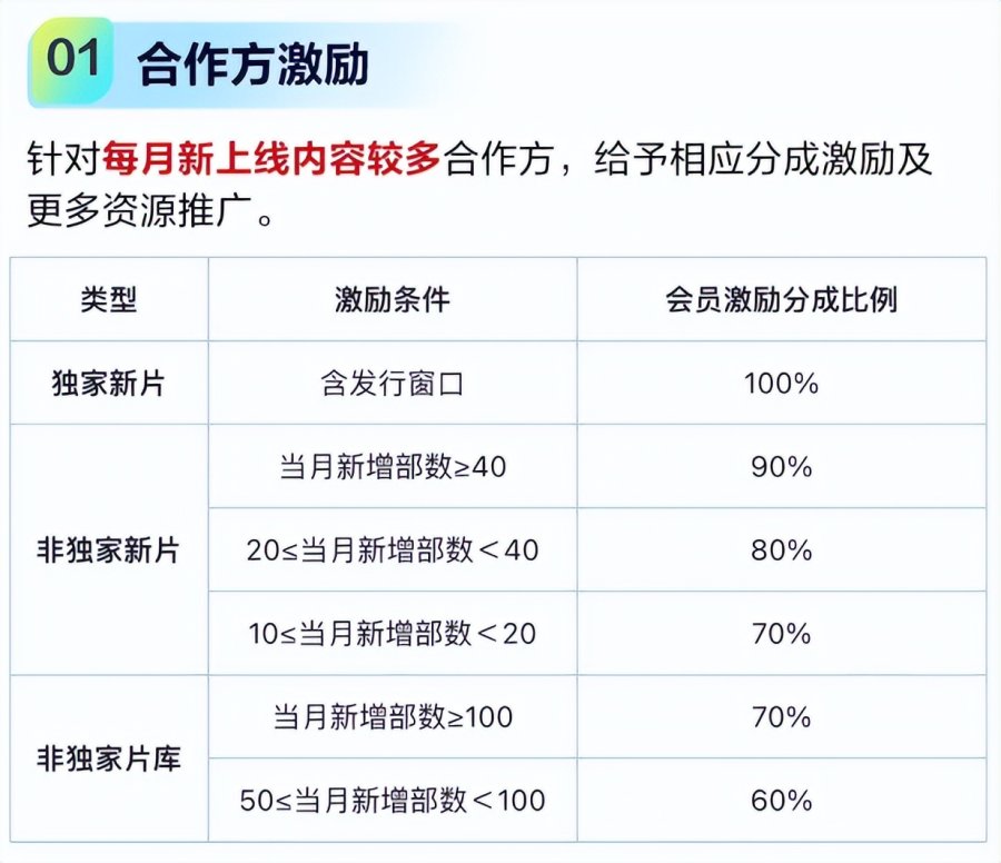 从合作计划来看,目前爱奇艺属于快速填充漫剧内容的阶段,鼓励合作方上线更多新片,部数越多分成比例越高。对于当月新增部数超过40部的合作方给予90%会员分成,独家新片分成比例更高达100%。