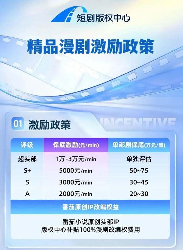 仅十天后,抖音再次发布“精品漫剧激励政策”,针对竖屏漫剧,最高能给超头部漫剧3万元一分钟的保底激励,按照一部漫剧100分钟,超头部的单部保底能到百万以上。据了解,目前精品漫剧成本普遍在30万左右,抖音直接的现金激励政策无疑将会刺激更多创作者与其绑定。