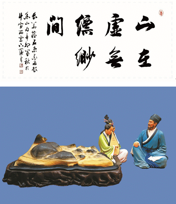 随后,将这块“吕梁石”置于几案,后面挂着“山在虚无缥缈间”的横幅,一旁摆着白居易的塑像,浑然一体,相得益彰,别有一番风韵。