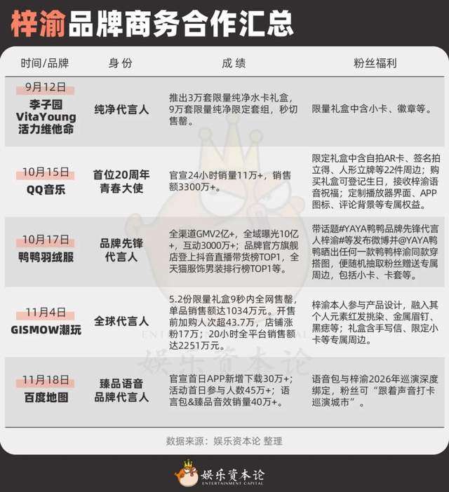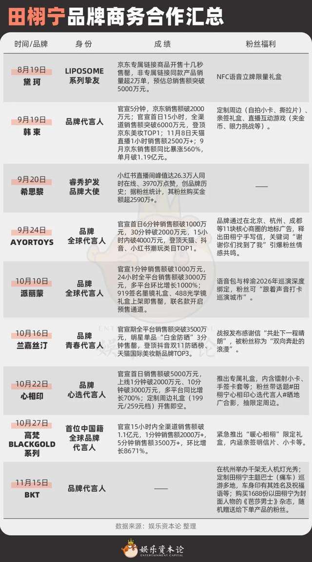 据娱乐资本论统计,至发稿为止,田栩宁已手握9个品牌商务合作,覆盖美妆、潮玩、眼镜、日化等多领域。