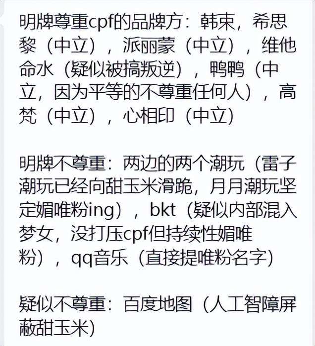 粉丝还自发对各品牌方进行了归类,哪些是媚唯粉的,哪些是媚CP粉的,哪些中立,并根据各商务战报总结推论哪一类粉籍占比更高,以抢占粉圈话语权高地。