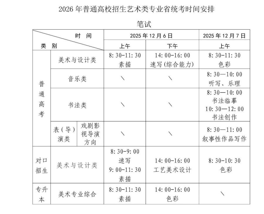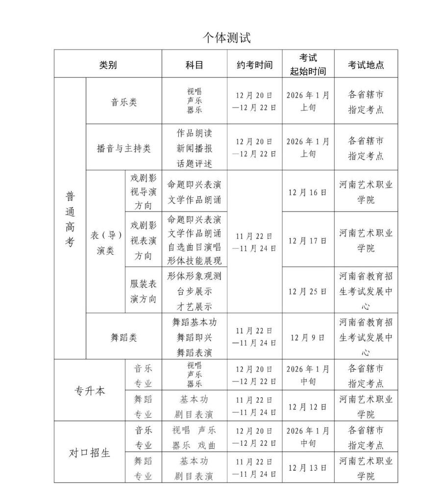 2026年普通高校招生艺术类专业河南省统考时间安排表