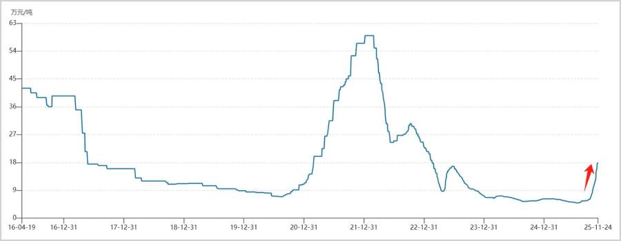 2025年7月,六氟磷酸锂最低价格不足5万元/吨,但随后迎来了绝地反击。截至11月24日,价格已飙升至18万元/吨,短短三个多月大涨超260%。