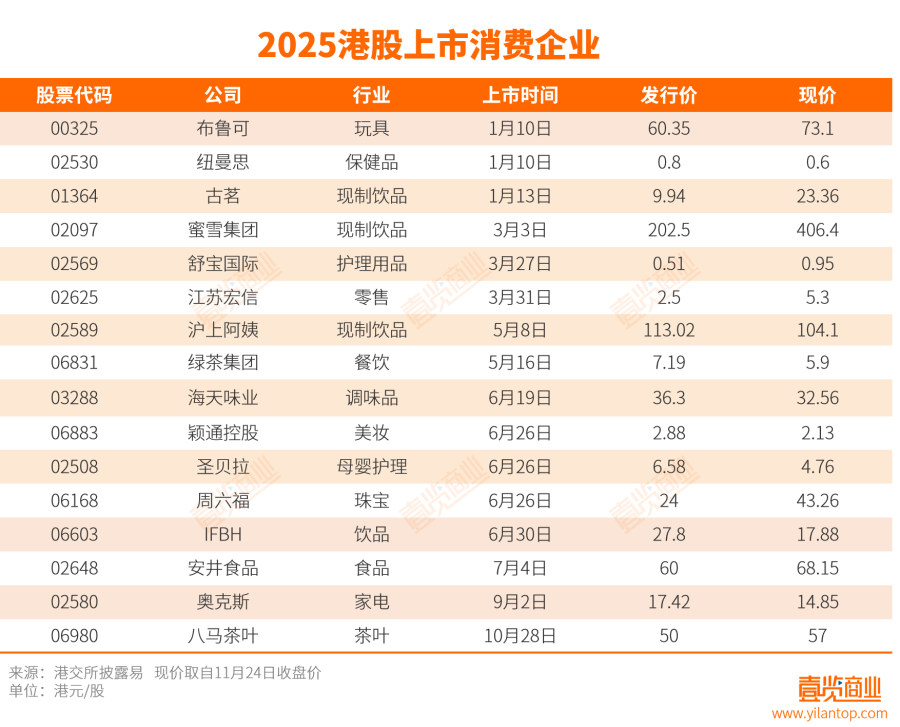 根据普华永道数据,2025年上半年港股新上市公司中,零售、消费品及服务类占比高达34%。据壹览商业不完全统计,从年初至10月底,已有至少15家消费类企业成功登陆港交所,涵盖饮品、食品、母婴个护、调味品、餐饮零售等多个细分行业。