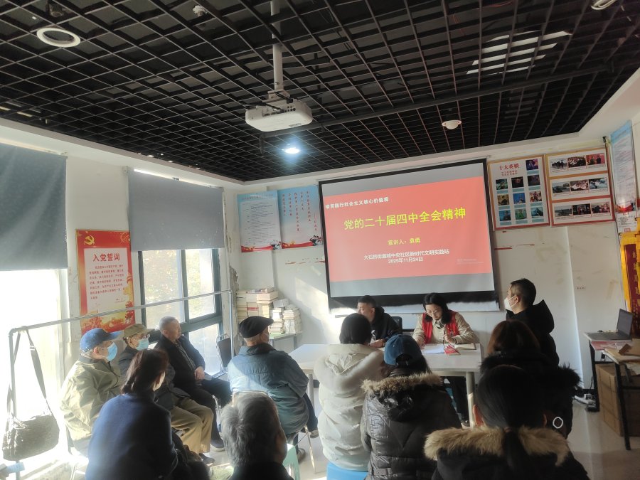 为深入学习贯彻党的二十届四中全会精神,让党的创新理论“飞入寻常百姓家”,11月24日,大石桥街道城中央社区开展了一场别开生面的宣讲活动,社区党总支书记袁勇担任主讲人,辖区党员、居民代表及社区工作者齐聚一堂,共同学习领会全会精神的深刻内涵。