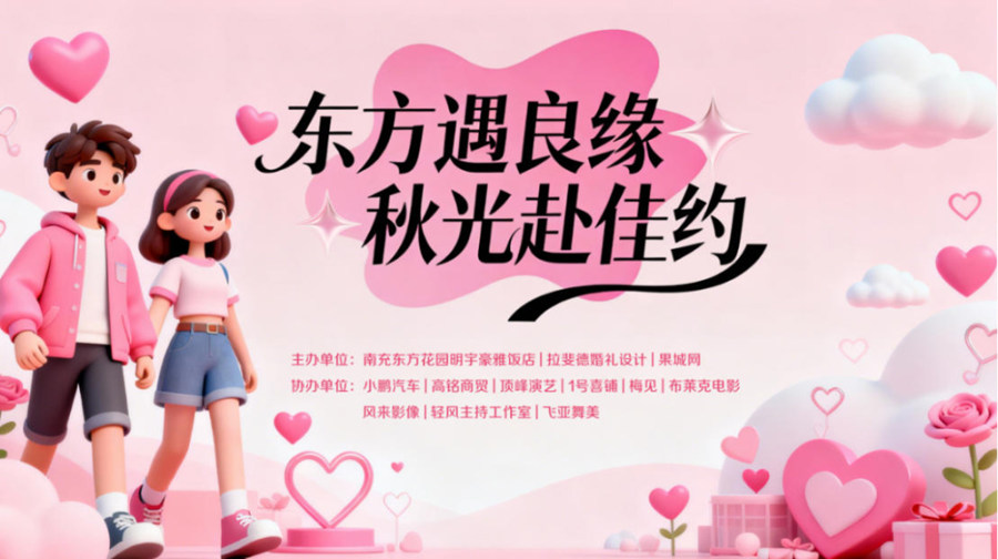 秋高气爽,爱意渐浓!11月28日15:00-18:00,由南充东方花园明宇豪雅饭店联合拉斐徳婚礼设计、果城网主办,小鹏汽车、高铭商贸、顶峰演艺、1号喜铺、梅见、布莱克电影、风来影像、轻风主持工作室、飞亚舞美多家品牌协办的「东方遇良缘·秋光赴佳约」相亲角·脱单便利店启动仪式暨秋冬婚礼沙龙,将在南充东方花园明宇豪雅饭店一楼草坪浪漫启幕。这场集脱单社交、婚尚发布、趣味互动于一体的盛会,已吸引众多未婚青年、待订婚宴宾客及本地媒体关注,提前锁定秋日浪漫焦点。