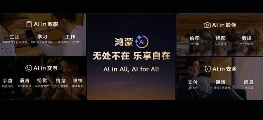 当然,鸿蒙6最吸睛的升级是AI能力。甚至可以说,在鸿蒙6,AI已无处不在,在效率提升、影像、交互、安全等方面均有诸多应用,用华为的话来说,就是“AI in All,AI for All”。
