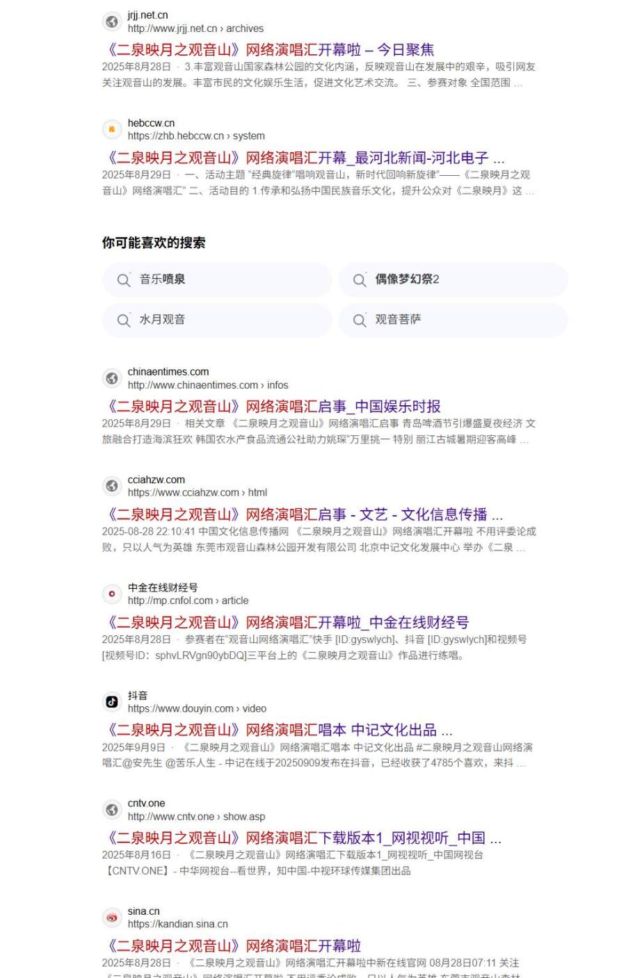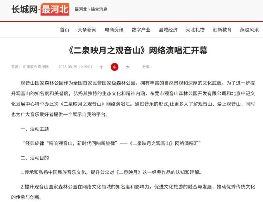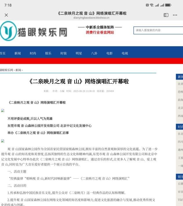 8月28日,“《二泉映月之观音山》网络演唱汇开幕啦”的消息见诸网络,包括《中国联合商报》、《长城网》、《中国娱乐时报》、《娱乐最前沿》等近千个网站。