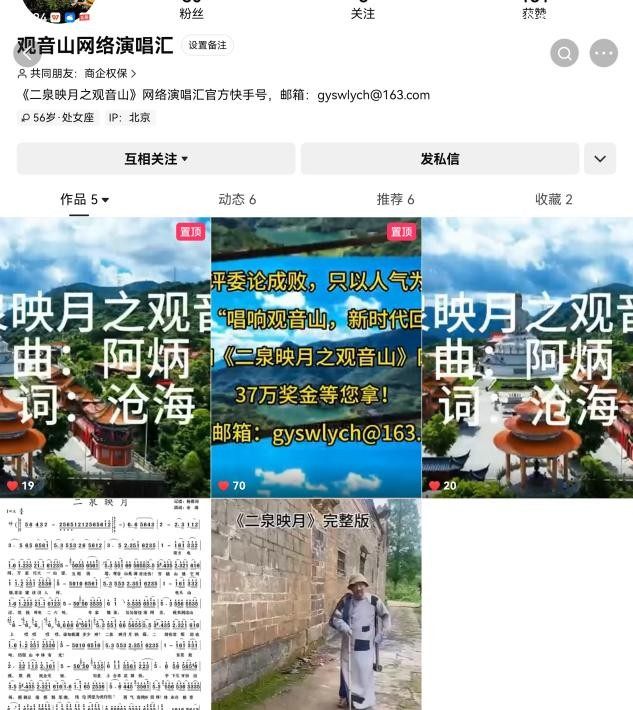 《二泉映月之观音山》是由沧海作词,采用阿炳的二胡乐曲制作的卡拉OK形似的视频在抖音、快手、视频号平台播放,吸引音乐爱好者进行演唱。广东观音山国家森林公园和北京中记文化发展中心联合举办的“《二泉映月之观音山》网络演唱汇”设置了冠军、亚军、季军各一名和10名优秀奖,举办方拿出了37万元奖金和多份观音山门票进行奖励。