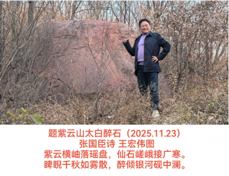 纵观《将进酒》,一个“怀”字贯穿全篇。诗中,那抒怀写人生,情怀写友人,遣怀写愤懑!2025年11月23日,我和嵩山文化研究会的专家们,走过荆棘丛生的羊肠小道,考察那巨大的紫云山“太白醉石”,感慨万千,挥笔诗道: