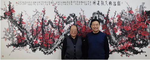 首届中国检察官文联主席张耕(左)画赠张国臣《龙腾梅香报春图》