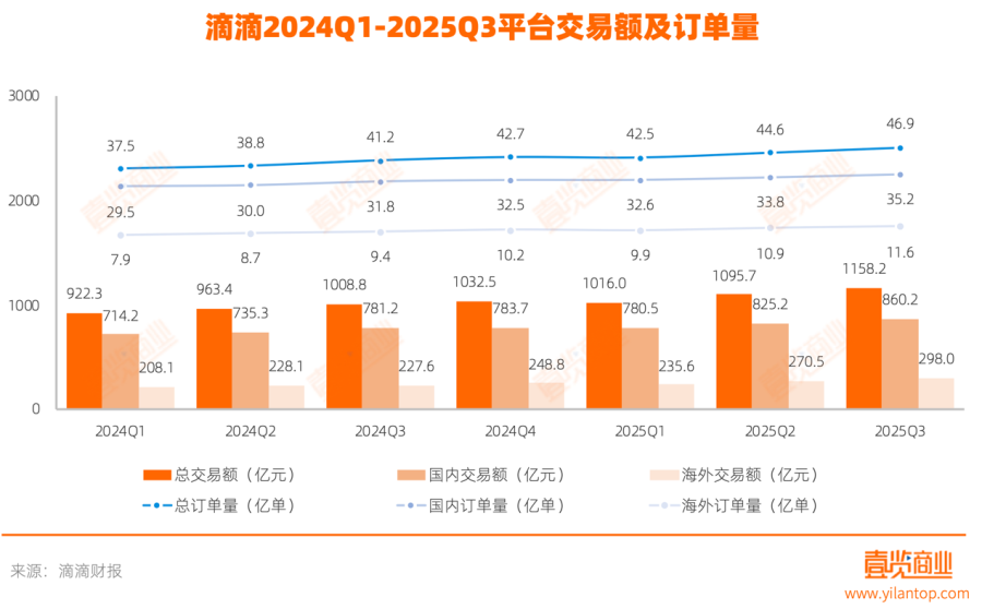 11月26日,滴滴发布了2025年第三季度财报。财报显示:滴滴第三季度核心平台总交易额(GTV)达到1158.2亿元,同比增长14.8%,实现连续5个季度GTV破千亿元;总订单量达到46.9亿单,同比增长13.8%,日均订单首次突破5000万,并连续11个季度保持了同比双位数的增长;净利润为14.6亿元,同比增长57%。