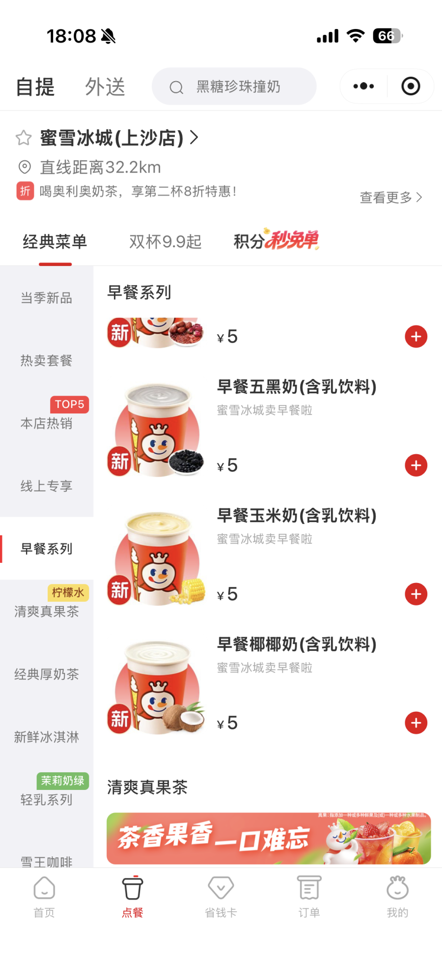 茶咖观察通过蜜雪冰城官方小程序进一步验证,发现杭州上沙店确实已上线“早餐系列”。目前产品包括早餐五红奶、早餐五黑奶、早餐玉米奶和早餐椰椰奶四款,售价均为5元,与爆料信息吻合。