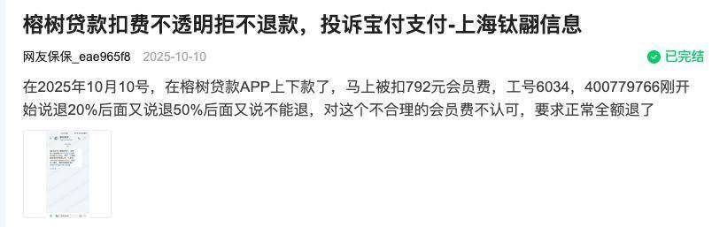 在消费保上,也有用户反映2025年10月10号在榕树贷款APP上下款后,马上被扣792元会员费,客服先是称退20%,后又说退50%,最终表示不能退,用户对此不合理的会员费不认可,要求全额退款,虽最终获得退款,但过程十分波折。