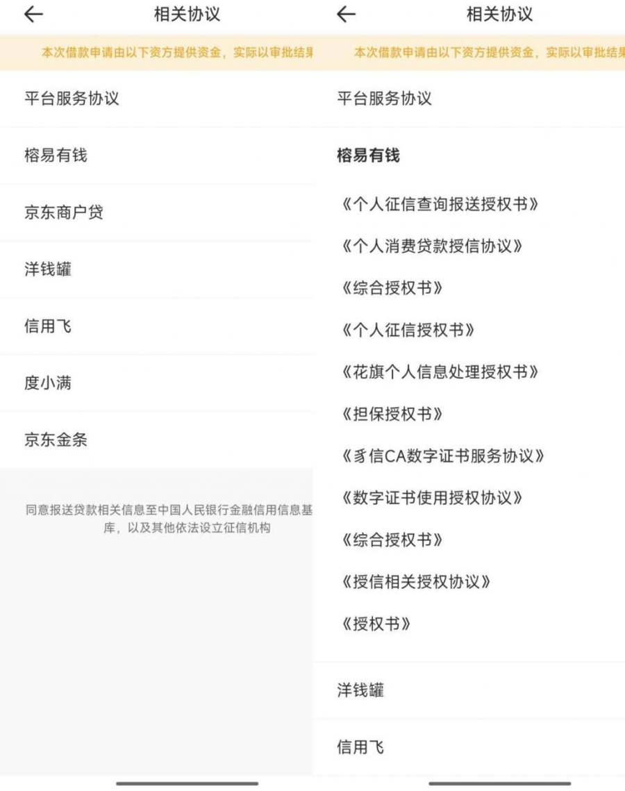 协议还显示,被授权人会向“数据分析服务提供商”“支付服务提供商”“电子签名和认证服务提供商”“增信合作方”“催收服务提供方”等第三方提供个人信息,但这些第三方机构具体是谁也未明确。在钱小乐APP上,最终在“设置-隐私设置-共享个人信息说明”里,虽能找到数据分析服务提供商、短信通知服务商、借款推荐服务商的具体公司,但“借款”服务的信息接收方即资金方仅用“提供服务的合规持牌金融机构”替代。通过与“平台服务协议”并列的相关协议,才得知其合作机构有“洋钱罐”“度小满”“信用飞”,多次退出后重新申请额度,还会出现不同的合作方,如“中邮消金”“美易借钱”。而钱小乐首页关于“持牌机构”的介绍中,又称借钱服务由晋商消金、中邮消金、开泰银行和苏商银行提供。
