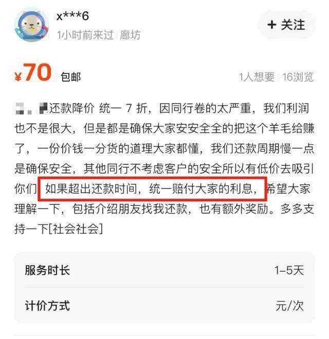 在代还折扣方面,信用卡及网贷的主流折扣在7-8折左右,相当于代还1万元借款仅收取7、8千的费用,这显然是亏本的买卖,但几乎没有卖家进一步说明为什么会有这种倒贴钱的服务,而只是强调“全程走闲鱼平台,代充成功后再确认收货,不成功全额退款”,甚至有部分卖家为招揽生意,还保证“如果超出还款时间,统一赔付大家的利息”。