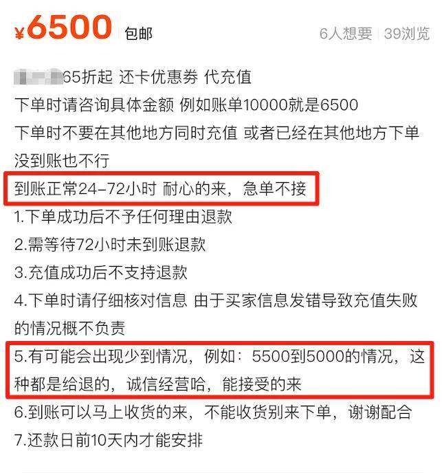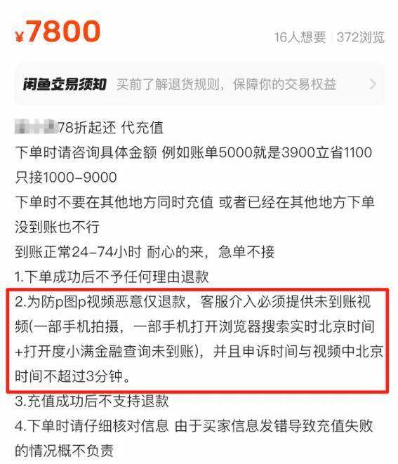 在诸多的注意事项中,部分事项非常容易理解,比如“下单时不要在其他地方同时充值,或者已经在其他地方下单没到账也不行”,但部分事项却非常另人费解,比如充值(也即代还)时限。不少卖家都在介绍页面明确声明,“到账时间24-72小时,急单不接”,或者“等待72小时后未到账,方可申请退款”。