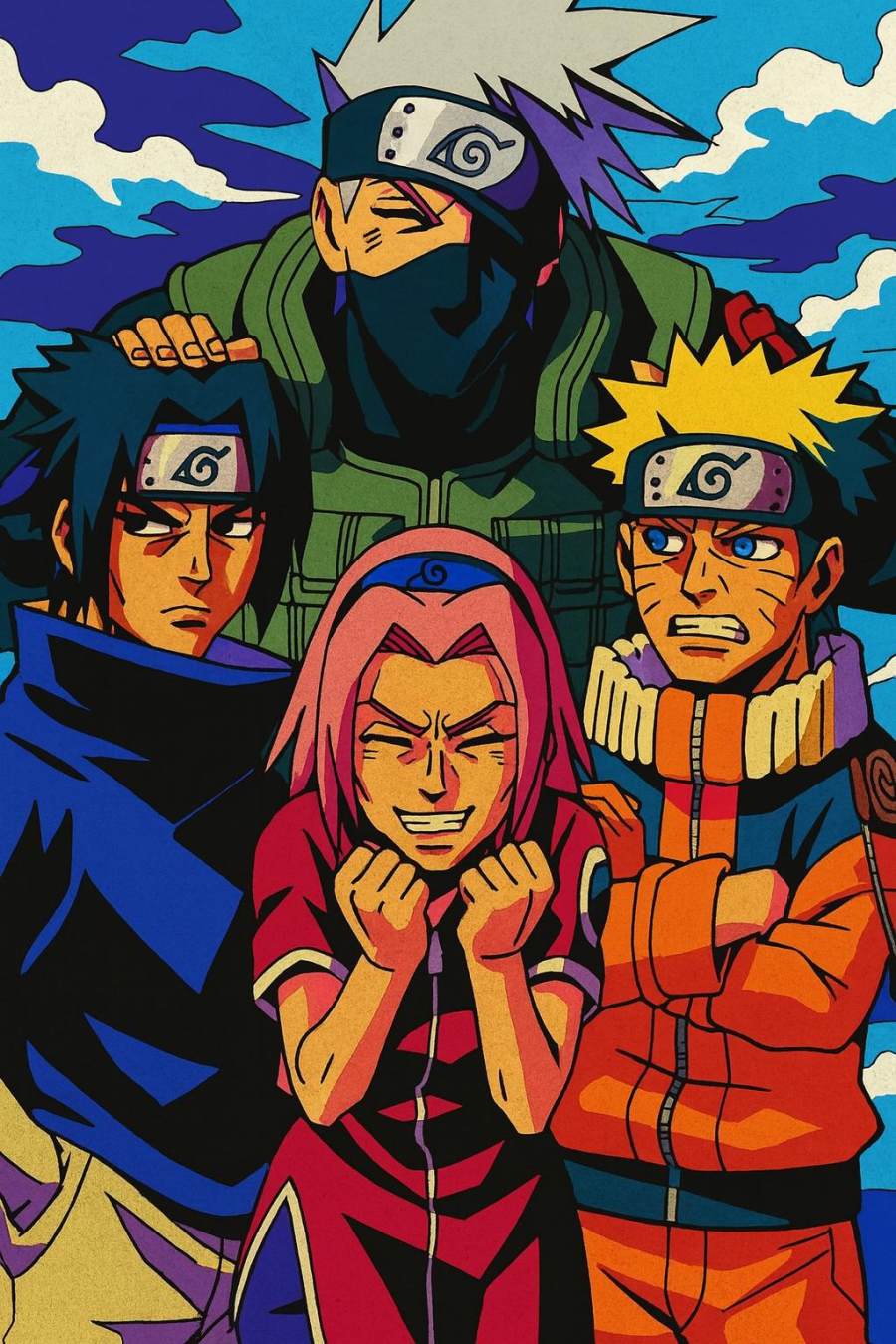 一眼精巧,除了卡卡西,基本每个人的表情都表达了相同的情绪,三个年轻忍者的体型都变成《 名侦探柯南 》那种头大身小的风格,但细看又有很多问题,背景被替换成了参考图的背景,三个年轻忍者的站位都变了,鸣人没有怒视佐助。