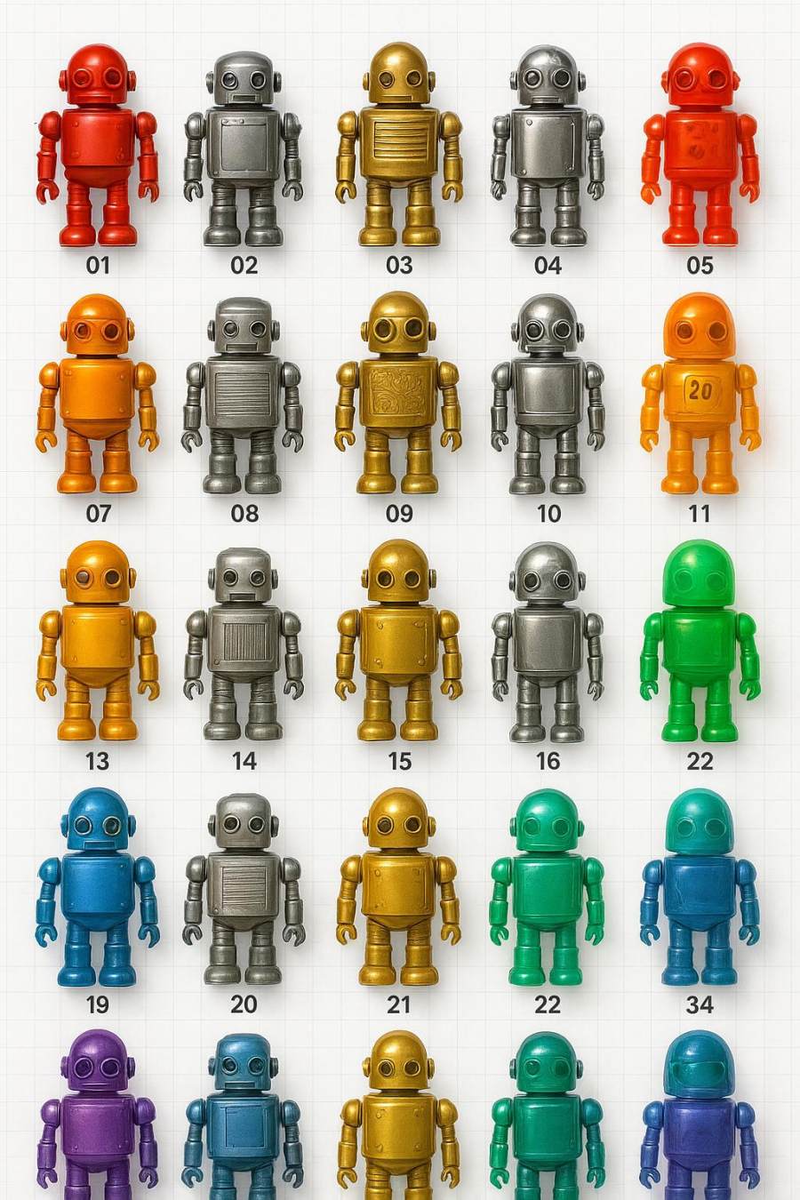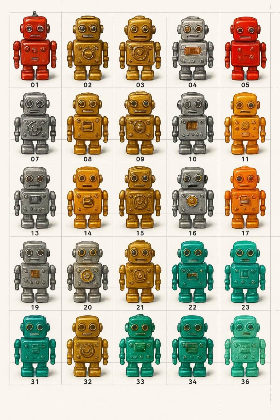 机器人风格:复古玩具(怀旧机械/齿轮/铆钉感),色彩鲜艳但材质各异(按规则分配),每行和每列遵循确定性属性映射(见下方规则),确保所有机器人互不重复。
