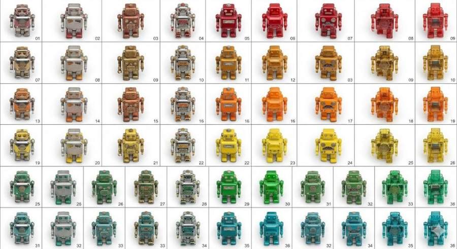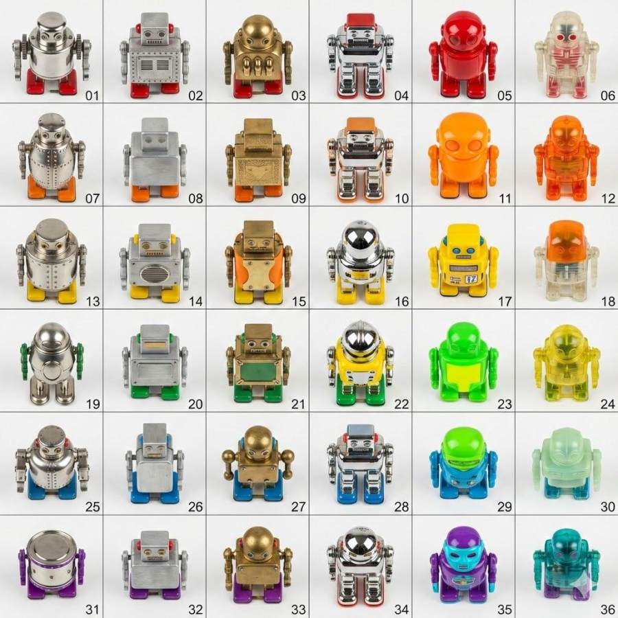 首先是直接批量生成 36 个 呈 6*6 网格排列的玩具机器人阵列,并且每个机器人的具体特征需要经过进一步推导才可得出,综合考验推理能力和生图能力,提示词会列出机器人基于行的颜色特征和基于列的表面特征。