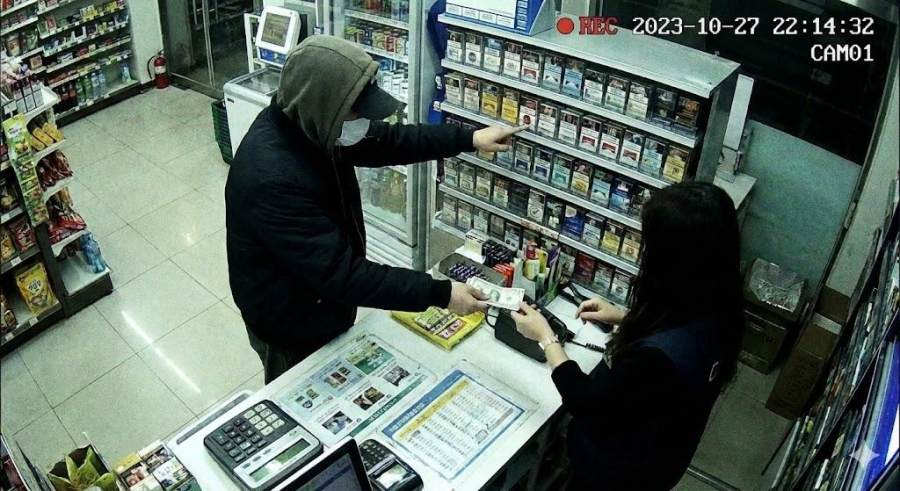 便利店收银台视角的监控画面,低分辨率,色彩略微失真,一个戴着口罩的人正在买烟。