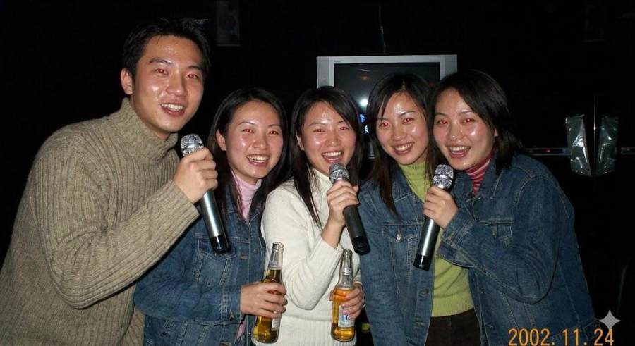 2000年代初的数码相机拍摄,直射闪光灯,一群年轻朋友在一家昏暗的 KTV 里,红眼效应,皮肤上的油光,背景漆黑。