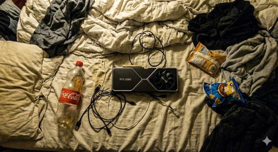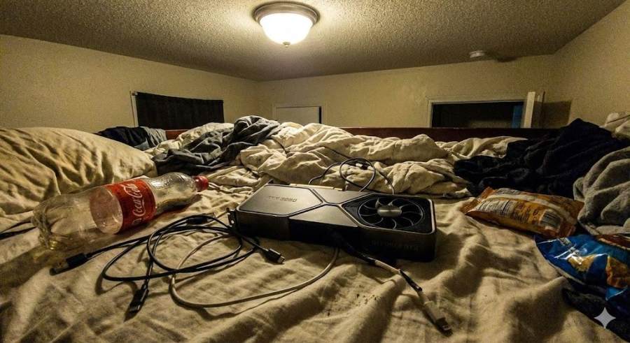 一张在乱糟糟的床上拍的二手显卡照片,床单皱皱巴巴,旁边还有杂乱的充电线和半瓶可乐,顶灯光线昏暗。