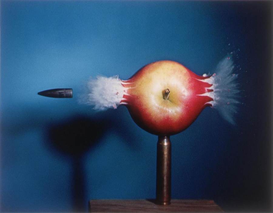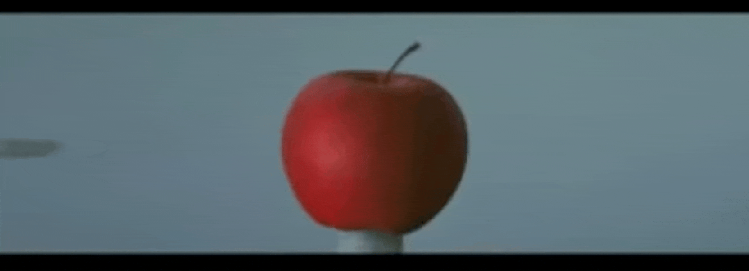 一颗子弹高速穿过一颗苹果的瞬间。实验室实拍,分辨率较低。