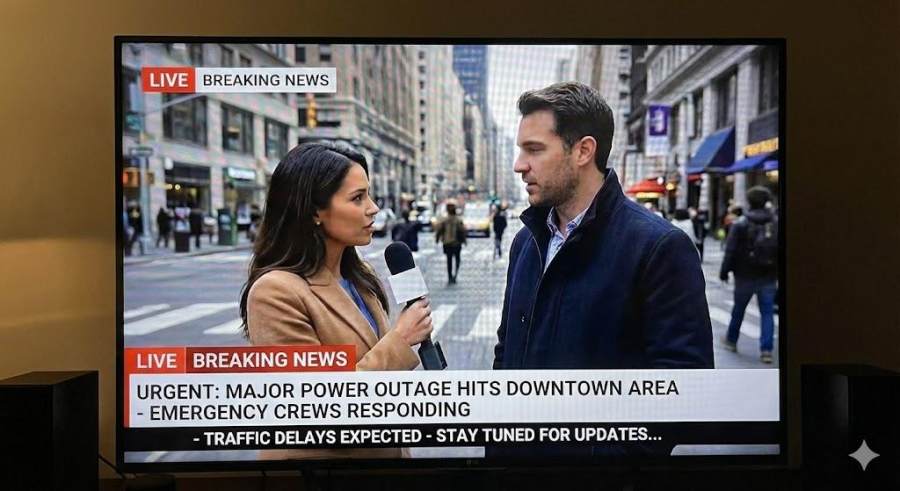 电视新闻画面的屏摄(用手机拍电视屏幕),能看到屏幕的像素摩尔纹,新闻底部有滚动字幕条,一个记者在街头采访。