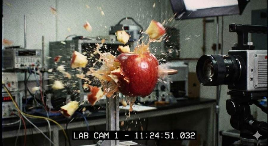 Nano Banana Pro 还能生成子弹穿过梨的图像,至于是否足够仿真暂时无法判断,知危没有找到类似的实验视频来比较。