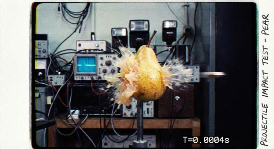 一颗子弹高速穿过一颗梨的瞬间。实验室实拍,分辨率较低。