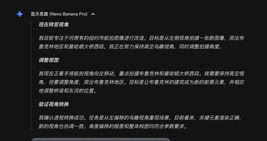 通过查看推导过程,发现 Nano Banana Pro 可以认出图中中央位置的大桥是曼哈顿大桥。