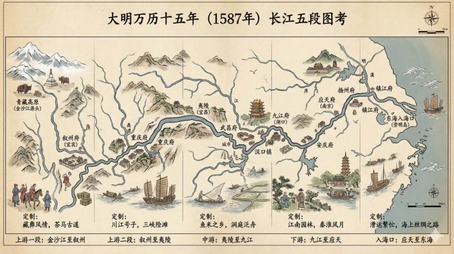 时间背景为明朝1587年,把长江划分为5段,用横版历史科普图的方式展示,以长江主河道为脉络(抽象化为直线),用文字和图像标注每一段的端点地理特征(比如城市、山脉等)、沿岸主要城市和民俗风情。