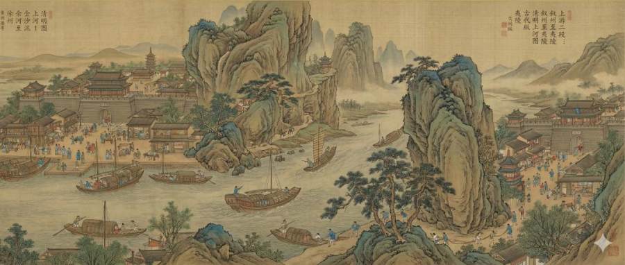 类似 PPT 生成这种保持多图一致性的场景测试,知危选用了更有趣的场景,仿照《 清明上河图 》做一个长江流域版本,需要五张图拼接完成;
