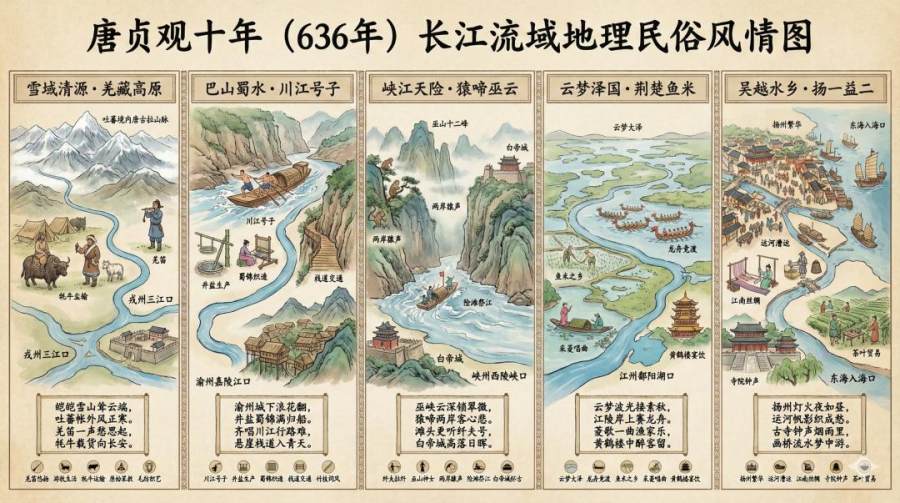 时间背景为唐朝636年,把长江划分为5段,用横版历史科普图的方式展示,以长江主河道为脉络(抽象化为直线),用文字和图像标注每一段的端点地理特征(比如城市、山脉等)、沿岸主要城市和民俗风情(每段至少5个),并给每一段基于民俗风情写一首七言绝句。