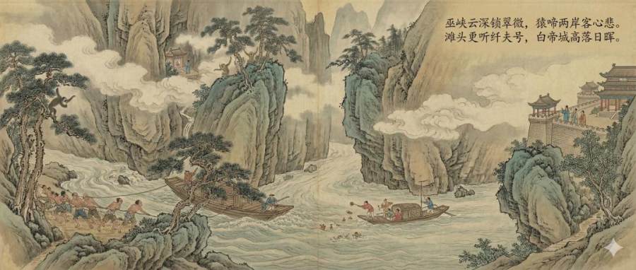Nano Banana Pro 重点刻画了长江的奔流以及三峡的壮丽景色,画面中还点缀着精致的船只,并在右侧过渡到夷陵。