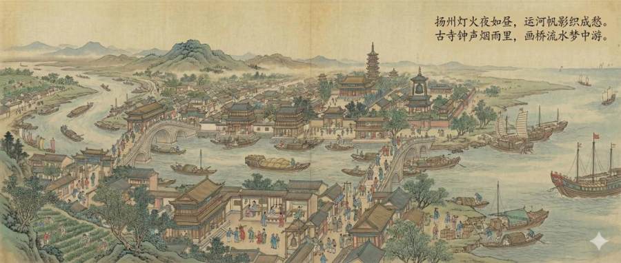 扬州繁华:当时中国最繁华的商业都会,号称“扬一益二”,夜市喧闹,胡商云集。