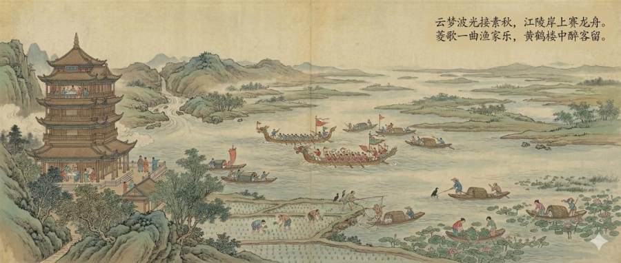 龙舟竞渡:荆楚之地纪念屈原的风俗极盛,端午节在江面举行赛龙舟活动。